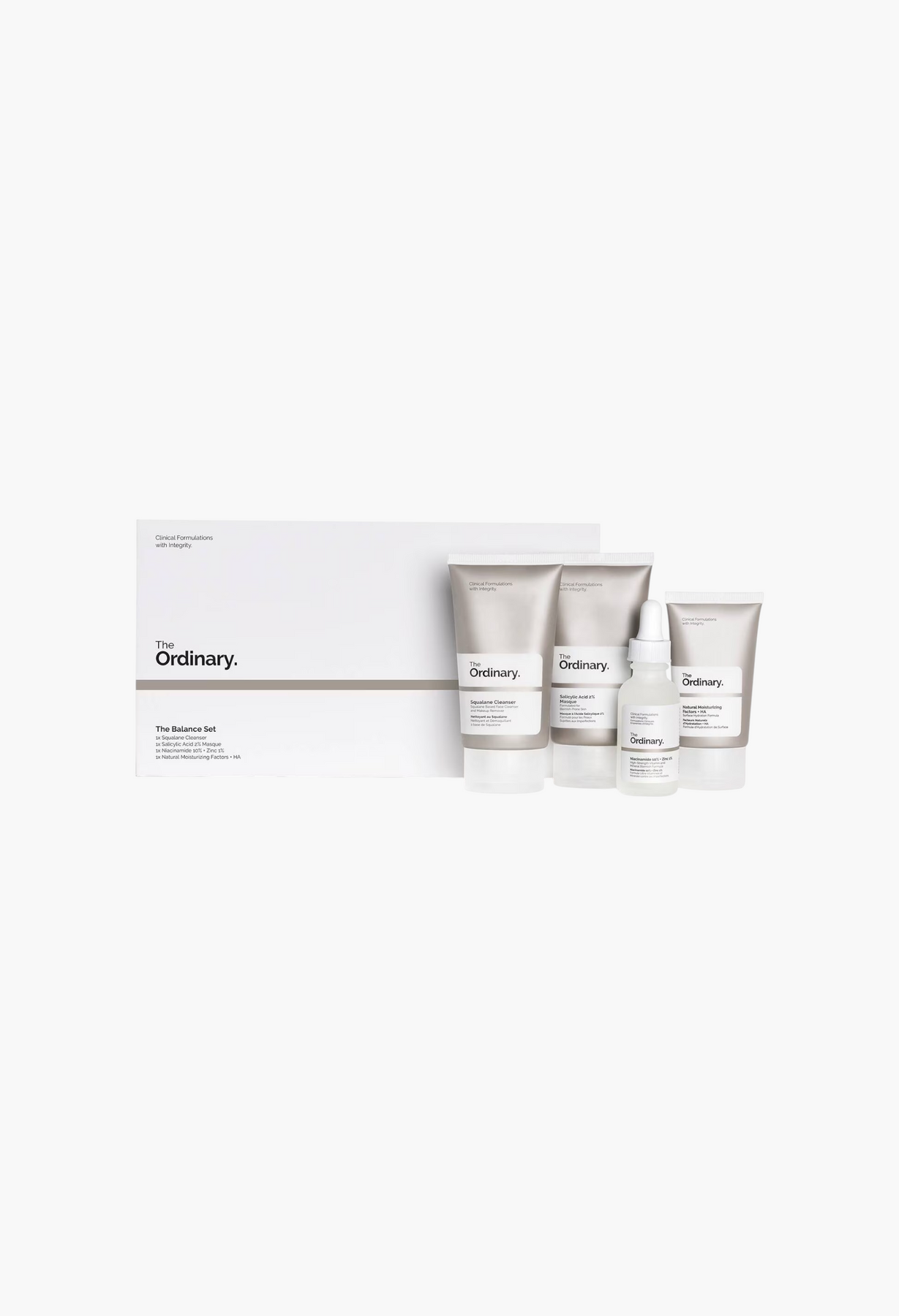 The Ordinary The Balance Set includes: - Squalane Cleanser 50ml A gentle cleansing product formulated to target makeup removal whilst leaving the skin feeling smooth and moisturized. The formula incorporates Squalane, alongside other lipophilic esters that are gentle, moisturizing, efficient in dissolving makeup and facial impurities and increasing the spreadability of the product. When rubbed between your palms for approximately 10-30 seconds, the product undergoes an important textural change from a balm-like consistency to a clear oil-like consistency. This allows the emulsifying sucrose esters in the formula to trap and blend the dissolved makeup and facial impurities with water for rinsing. Being non-comedogenic and soap-free, this formula is designed to be gentle enough for daily use, without over-drying the skin, making it suitable for all skin types. - Salicylic Acid 2% Masque 50ml Salicylic Acid 2% Masque is formulated to target lackluster tone and textural irregularities. The formula, infused with charcoal and clays, aims to enhance the appearance of smoothness and clarity, leaving the skin feeling refreshed. The structure of salicylic acid facilitates its lipophilicity and miscibility with the lipids located on the surface of the skin. It is a suitable ingredient for targeting the removal of dead skin cells on the surface of oily and blemish-prone skin, with the purpose of revealing more radiant skin beneath. Charcoal and clays are ingredients renowned for their deep cleansing abilities due to their porosity and large surface area available for adsorption. They aid the removal of facial impurities that would otherwise remain on the skin surface and clog pores. In comparison to Salicylic Acid 2% Solution, Salicylic Acid 2% Masque is a rinse-off formula. Leave on for no longer than 10 minutes in order to maximize the exfoliating benefits. - Niacinamide 10% + Zinc 1% 30ml High-Strength Vitamin and Mineral Blemish Formula; Niacinamide (Vitamin B3) is indicated to reduce the appearance of skin blemishes and congestion. A high 10% concentration of this vitamin is supported in the formula by zinc salt of pyrrolidone carboxylic acid to balance visible aspects of sebum activity. Contraindications: If topical Vitamin C (L-Ascorbic Acid and/or Ethylated L-Ascorbic Acid) is used as part of skincare, it should be applied at alternate times with this formula (ideally Vitamin C in the PM and this formula in the AM). Otherwise, Niacinamide can affect integrity of the Vitamin C. Notes: While Niacinamide and Zinc PCA reduce the look of blemishes and balance visible sebum activity, neither is a treatment for acne. For persistent acne-related conditions, we recommend the use of Benzoyl Peroxide and/or Retinoic Acid. DECIEM doesn't recommend ongoing use of BHA such as Salicylic Acid for persistent blemishes. For temporary improvement in appearance of blemishes, Salicylic Acid would help. This formulation can be used alongside acne treatments if desired for added visible skin benefits. - Natural Moisturizing Factors + HA 30ml Natural Moisturizing Factors (NMF) are elements that keep the outer layer of the skin protected and well-hydrated. NMF are made up of multiple amino acids, fatty acids, triglycerides, urea, ceramides, phospholipids, glycerin, saccharides, sodium PCA, hyaluronic acid and manyother compounds that are naturally present in the skin. This formula offers non-greasy hydration that acts as a direct topical supplement of impaired NMF components. It contains 11 amino acids, phospholipids, alpha/beta/gamma fatty acids, triglycerides, sterols and sterol esters, glycerin, ceramide precursors, urea, saccharides, sodium PCA and hyaluronic acid. It offers immediate hydration and lasting results with continued use.
